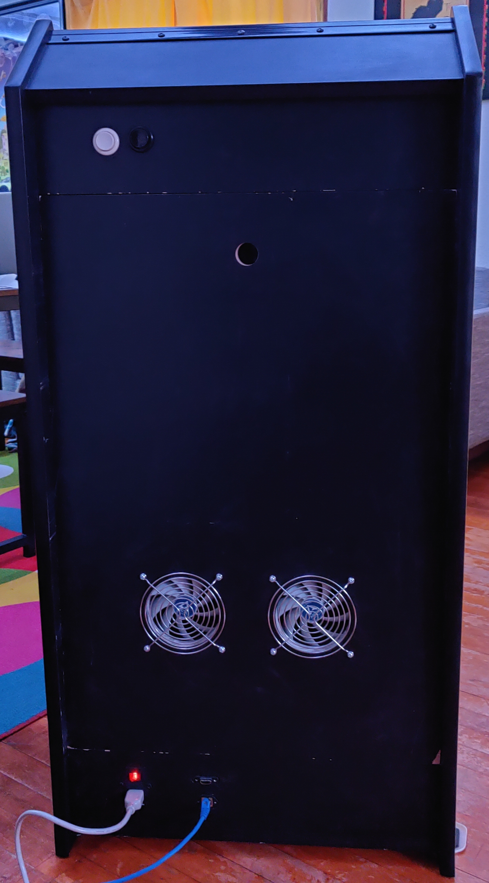 The back of the cabinet has a power jack, RJ-45 jack and an HDMI output jack. There is also a pair of old arcade buttons I had, which I use to send power on / off signals to the computer via the I-PAC. Flipping the power switch on the power jack will already cause the computer inside to boot up. There are a pair of 120mm fans for keeping everything cool and plenty of airflow since the panels at the top of the back leave a nice hidden gap to allow for hot air to escape.